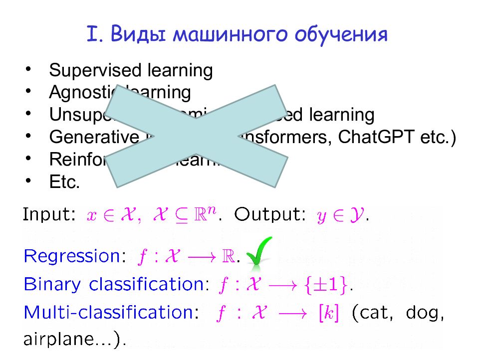 I. Виды машинного обучения Supervised learning Agnostic learning Unsupervised/semi-supervised learning Generative learning (transformers, ChatGPT etc.) Reinforcement learning Etc.