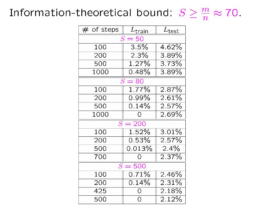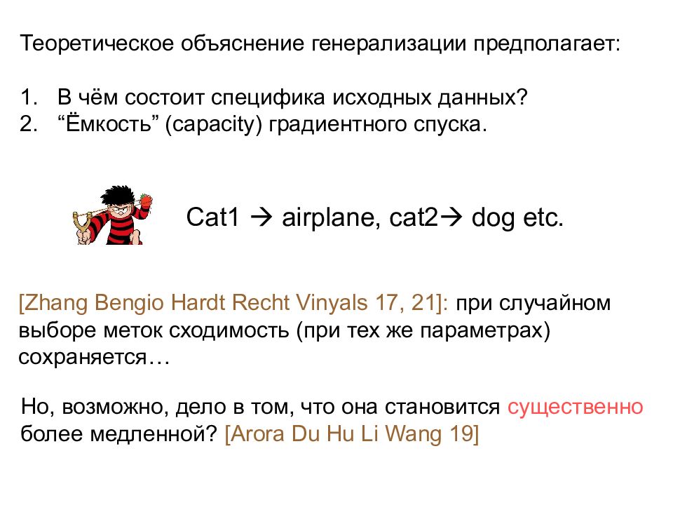 Теоретическое объяснение генерализации предполагает : В чём состоит специфика исходных данных ? “ Ёмкость ” ( capacity ) градиентного спуска. Cat1 airplane, cat2 dog etc. [Zhang Bengio Hardt Recht Vinyals 17, 21]: при случайном выборе меток сходимость ( при тех же параметрах ) сохраняется … Но, возможно, дело в том, что она становится существенно более медленной ? [ Arora Du Hu Li Wang 19]