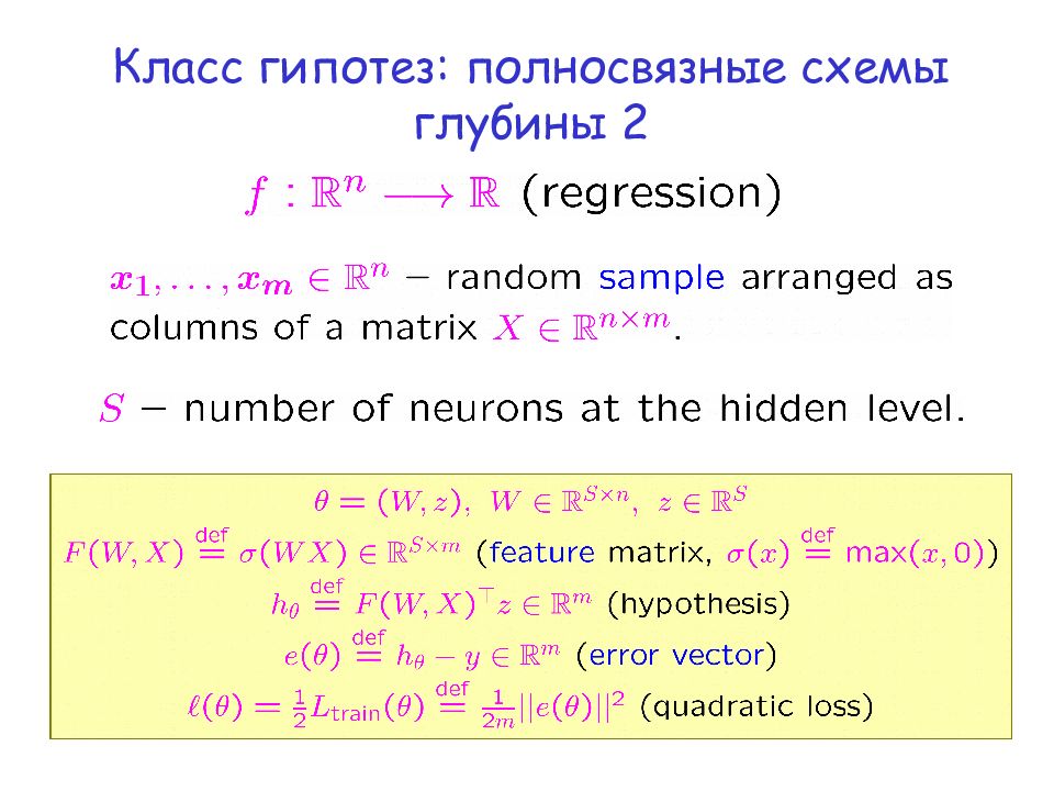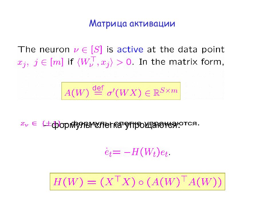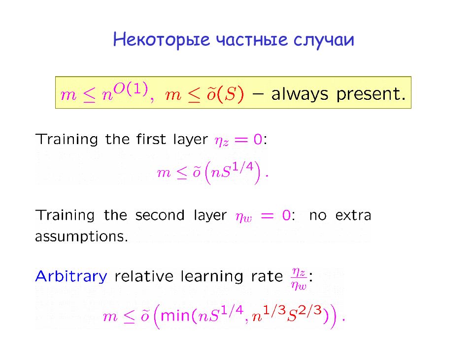 Часть II: от к Типичные результаты никак не зависят от меток ( ср. [Zhang Bengio Hardt Recht Vinyals 17, 21 ] ). Это снижает их ценно сть для изучения генерализации. Они относятся к так называемому NTK - режиму (lazy training). На практике обучение происходит далеко за его пределами. Число нейронов неоправданно велико. [ Du Zhai Pocsoz Singh 19, Wu Du Ward 19, Oymak Soltanolkotabi 19, Song Yang 20, Nguyen 21, R. 22 ] Критические замечания
