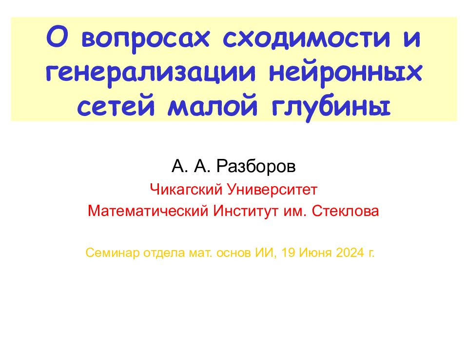 А. А. Разборов Чикагский Университет Математический Институт им. Стеклова Семинар отдела мат. о снов ИИ, 19 Июня 2024 г. О вопросах сходимости и генерализации нейронных сетей малой глубины