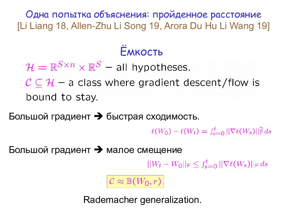 Одна попытка объяснения : пройденное расстояние [Li Liang 18, Allen-Zhu Li Song 19, Arora Du Hu Li Wang 19] Ёмкость Большой градиент быстрая сходимость. Большой градиент малое смещение Rademacher generalization.
