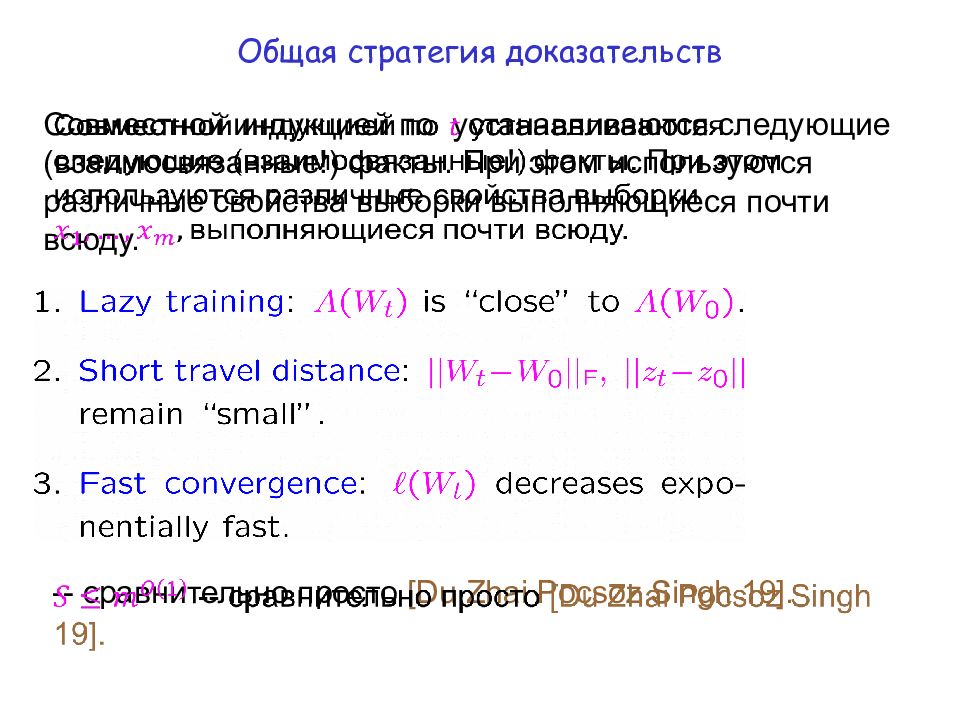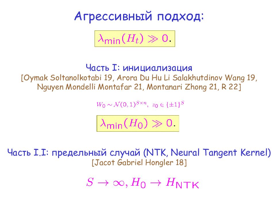 Агрессивный подход : Часть I: инициализация [ Oymak Soltanolkotabi 19, Arora Du Hu Li Salakhutdinov Wang 19, Nguyen Mondelli Montafar 21, Montanari Zhong 21, R 22] Часть I.I: предельный случай (NTK, Neural Tangent Kernel) [ Jacot Gabriel Hongler 18]
