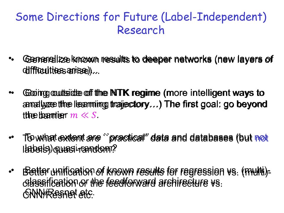 Some Directions for Future (Label-Independent) Research Generalize known results to deeper networks (new layers of difficulties arise)... Going outside of the NTK regime (more intelligent ways to analyze the learning trajectory…) The first goal: go beyond the barrier To what extent are ``practical’’ data and databases (but not labels) quasi-random? Better unification of known results for regression vs. (multi)-classification or the feedforward archirecture vs. CNN/ Resnet etc.