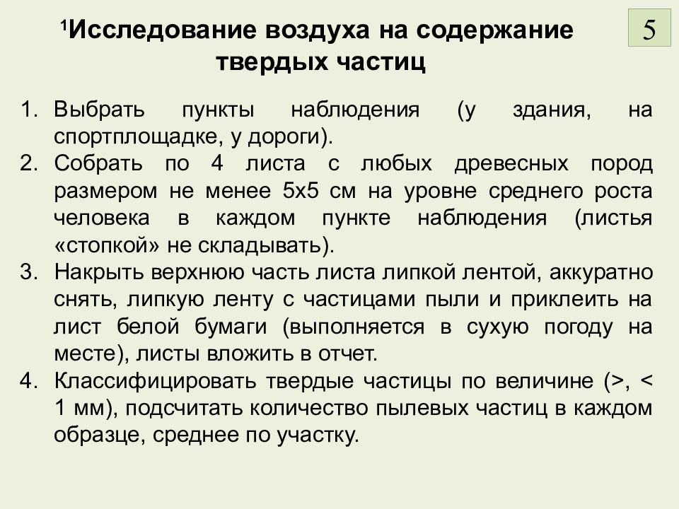 Выбрать пункты наблюдения (у здания, на спортплощадке, у дороги). Собрать по 4 листа с любых древесных пород размером не менее 5х5 см на уровне среднего роста человека в каждом пункте наблюдения (листья «стопкой» не складывать). Накрыть верхнюю часть листа липкой лентой, аккуратно снять, липкую ленту с частицами пыли и приклеить на лист белой бумаги (выполняется в сухую погоду на месте), листы вложить в отчет. Классифицировать твердые частицы по величине (>, < 1 мм), подсчитать количество пылевых частиц в каждом образце, среднее по участку. 5 1 Исследование воздуха на содержание твердых частиц