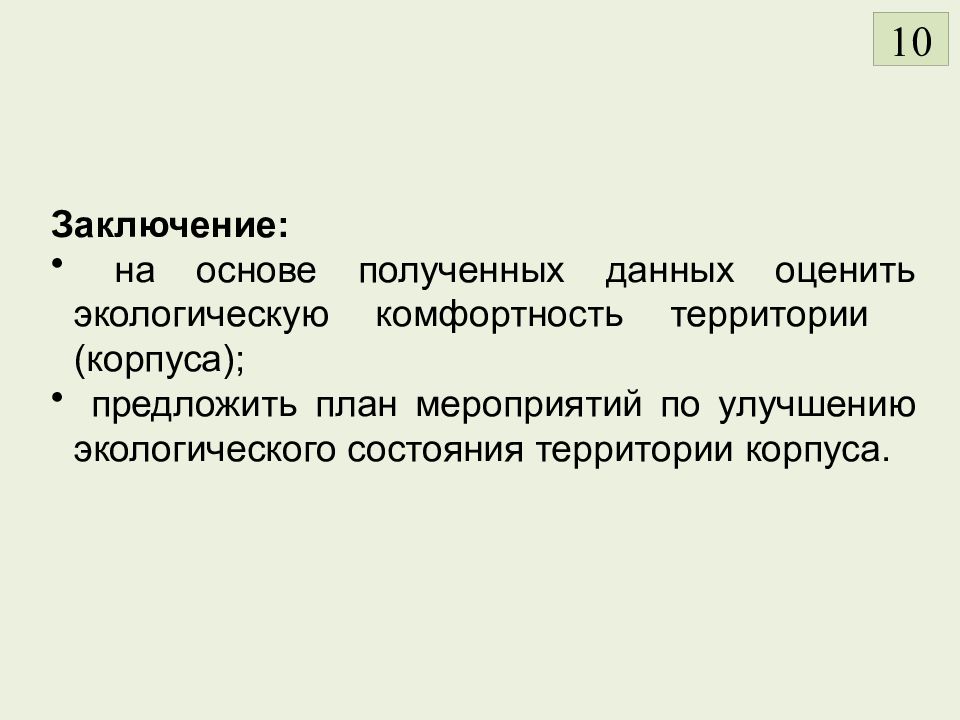 10 Заключение: на основе полученных данных оценить экологическую комфортность территории (корпуса); предложить план мероприятий по улучшению экологического состояния территории корпуса.
