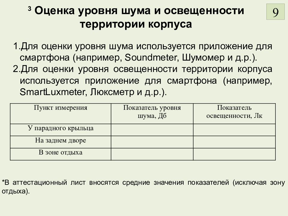 9 Пункт измерения Показатель уровня шума, Дб Показатель освещенности, Л к У парадного крыльца На заднем дворе В зоне отдыха Для оценки уровня шума используется приложение для смартфона (например, Soundmeter, Шумомер и д.р.). Для оценки уровня освещенности территории корпуса используется приложение для смартфона (например, SmartLuxmeter, Люксметр и д.р.). 3 Оценка уровня шума и освещенности территории корпуса *В аттестационный лист вносятся средние значения показателей (исключая зону отдыха).
