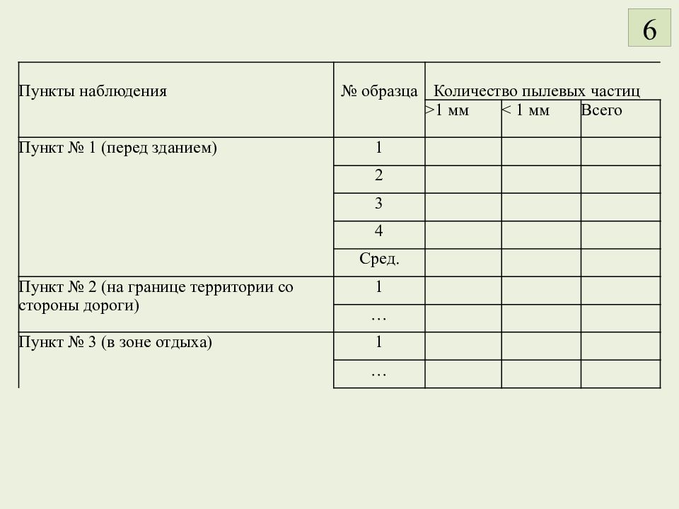 Пункты наблюдения № о бразца Количество пылевых частиц >1 мм < 1 мм Всего Пункт № 1 (перед зданием) 1 2 3 4 Сред. Пункт № 2 (на границе территории со стороны дороги ) 1 … Пункт № 3 (в зоне отдыха ) 1 … 6