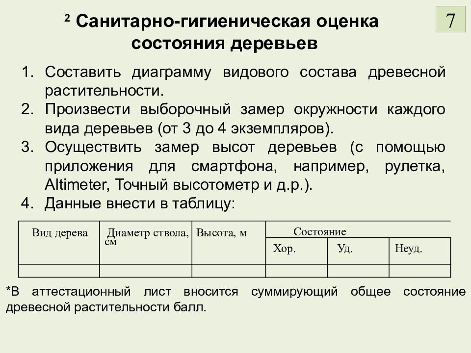 7 Вид дерева Диаметр ствола, см Высота, м Состояние Хор. Уд. Неуд. Составить диаграмму видового состава древесной растительности. Произвести выборочный замер окружности каждого вида деревьев (от 3 до 4 экземпляров). Осуществить замер высот деревьев (с помощью приложения для смартфона, например, рулетка, Altimeter, Точный высотометр и д.р.). Данные внести в таблицу: 2 Санитарно-гигиеническая оценка состояния деревьев *В аттестационный лист вносится суммирующий общее состояние древесной растительности балл.