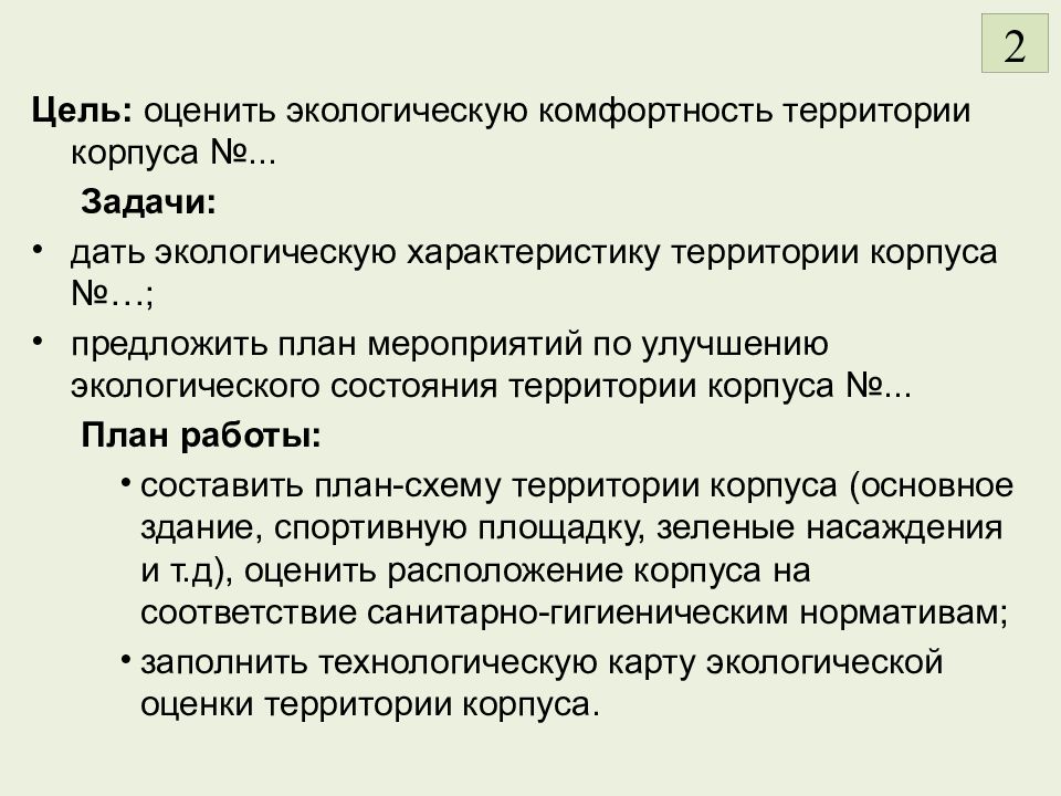 Цель: оценить экологическую комфортность территории корпуса №... Задачи : дать экологическую характеристику территории корпуса №…; предложить план мероприятий по улучшению экологического состояния территории корпуса №... План работы: составить план-схему территории корпуса ( основное здание, спортивную площадку, зеленые насаждения и т.д ), оценить расположение корпуса на соответствие санитарно-гигиеническим нормативам ; заполнить технологическую карту экологической оценки территории корпуса. 2
