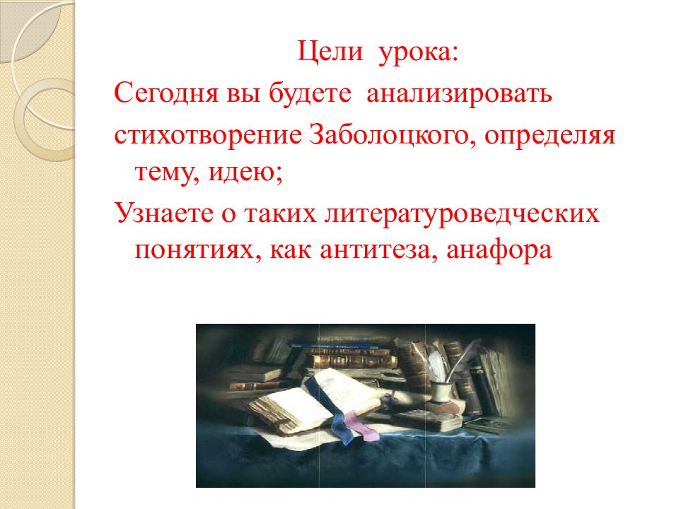 Цели урока: Сегодня в ы будете анализировать стихотворение Заболоцкого, определяя тему, идею; Узнаете о таких литературоведческих понятиях, как антитеза, анафора
