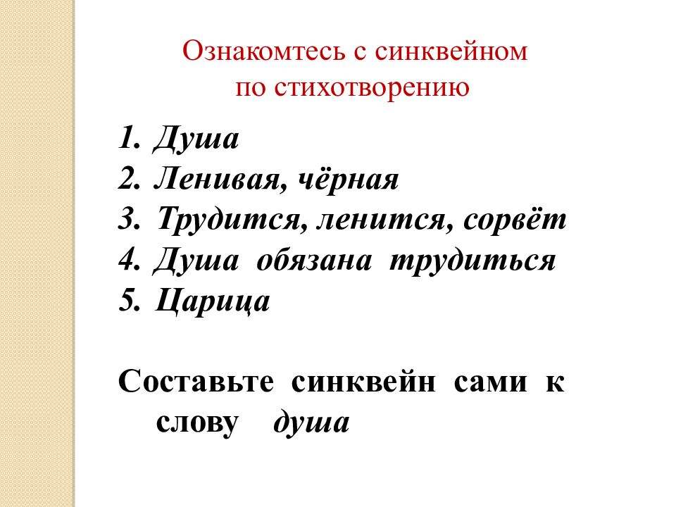 Ознакомтесь с синквейном по стихотворению Душа Ленивая, ч ёрная Трудится, ленится, сорв ёт Душа обязана трудиться Царица Составьте синквейн сами к слову душа