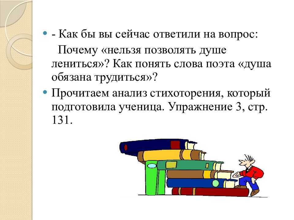 - Как бы вы сейчас ответили на вопрос: Почему «нельзя позволять душе лениться»? Как понять слова поэта « душа обязана трудиться »? Прочитаем анализ стихоторения, который подготовила ученица. Упражнение 3, стр. 131.