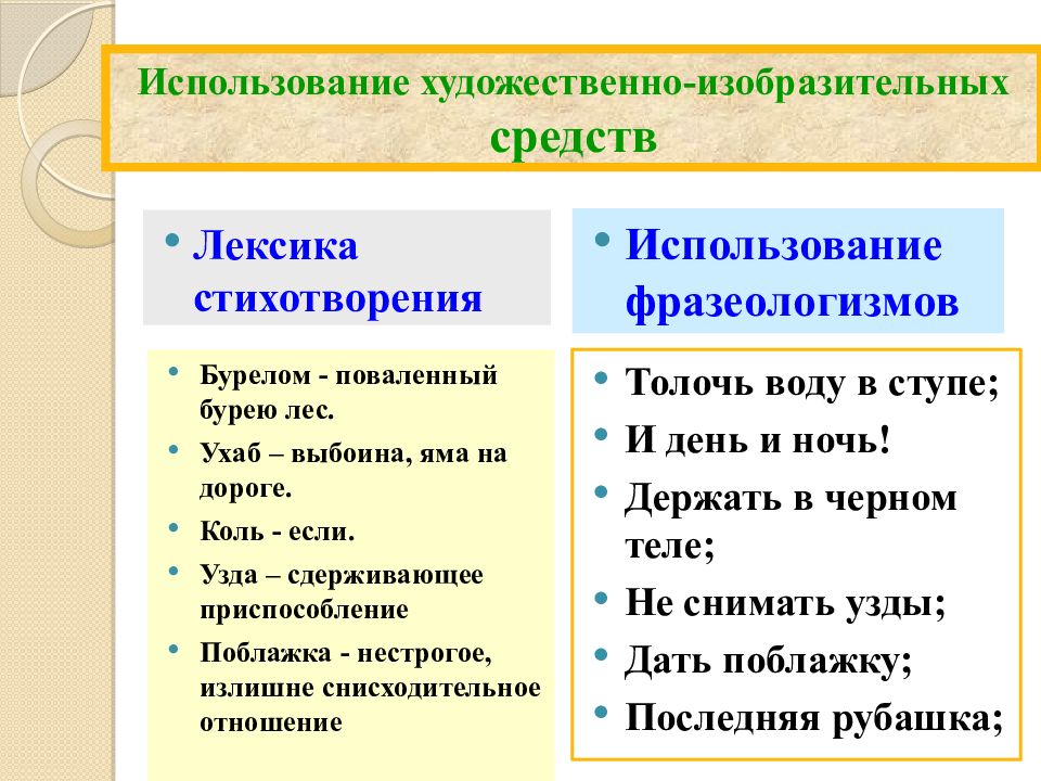 Лексика стихотворения Использование фразеологизмов Бурелом - поваленный бурею лес. Ухаб – выбоина, яма на дороге. Коль - если. Узда – сдерживающее приспособление Поблажка - нестрогое, излишне снисходительное отношение Толочь воду в ступе; И день и ночь! Держать в черном теле; Не снимать узды; Дать поблажку; Последняя рубашка;
