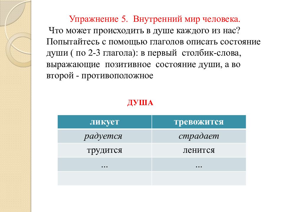 ДУША Упражнение 5. Внутренний мир человека. Что может происходить в душе каждого из нас? Попытайтесь с помощью глаголов описать состояние души ( по 2-3 глагола): в первый столбик-слова, выражающие позитивное состояние души, а во второй - противоположное ликует тревожится радуется страдает трудится ленится ... ...