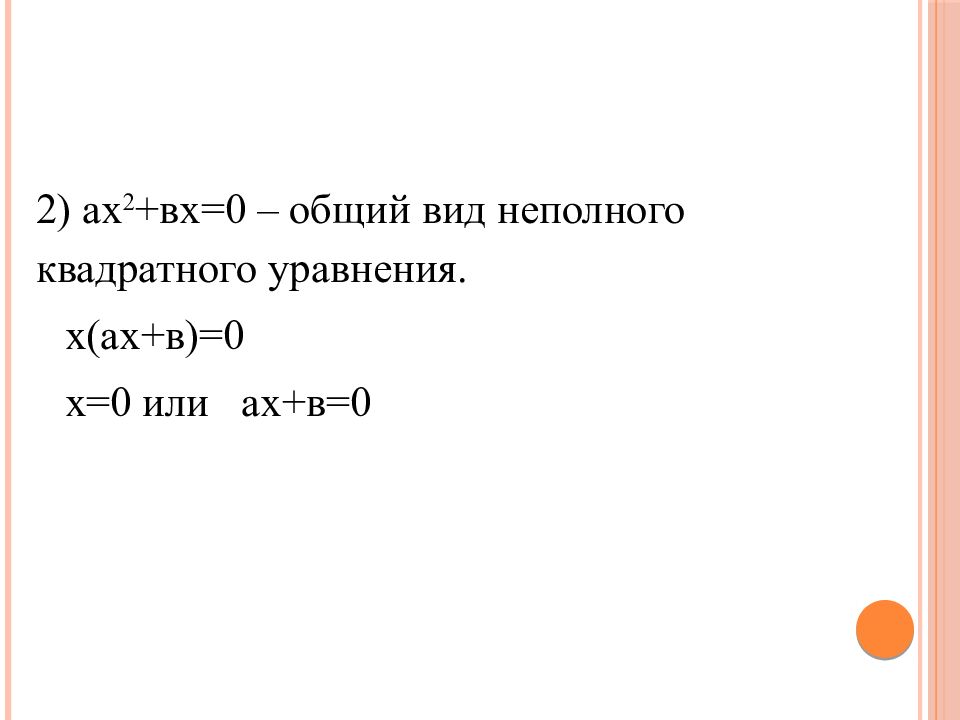 2) ах 2 +вх=0 – общий вид неполного квадратного уравнения. х( ах+в )=0 х=0 или ах+в =0