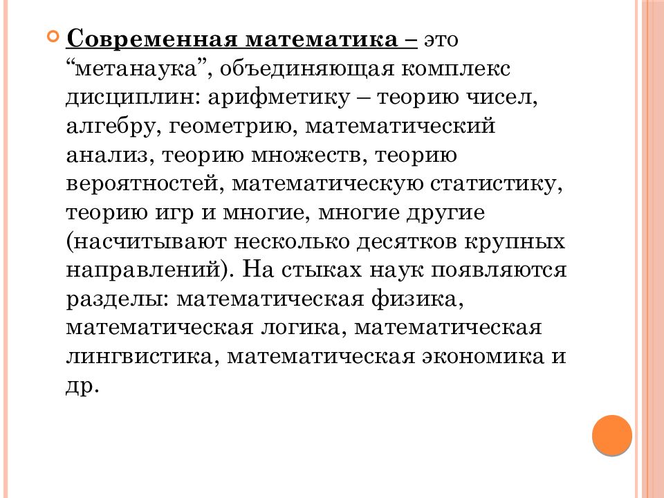 Современная математика – это “ метанаука ”, объединяющая комплекс дисциплин: арифметику – теорию чисел, алгебру, геометрию, математический анализ, теорию множеств, теорию вероятностей, математическую статистику, теорию игр и многие, многие другие (насчитывают несколько десятков крупных направлений). На стыках наук появляются разделы: математическая физика, математическая логика, математическая лингвистика, математическая экономика и др.