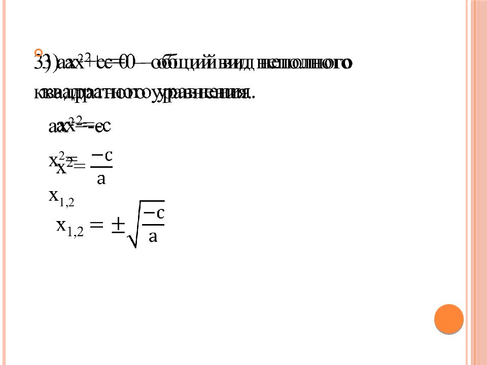 3) ах 2 +с=0 – общий вид неполного квадратного уравнения. ах 2 =-с х 2 = х 1,2