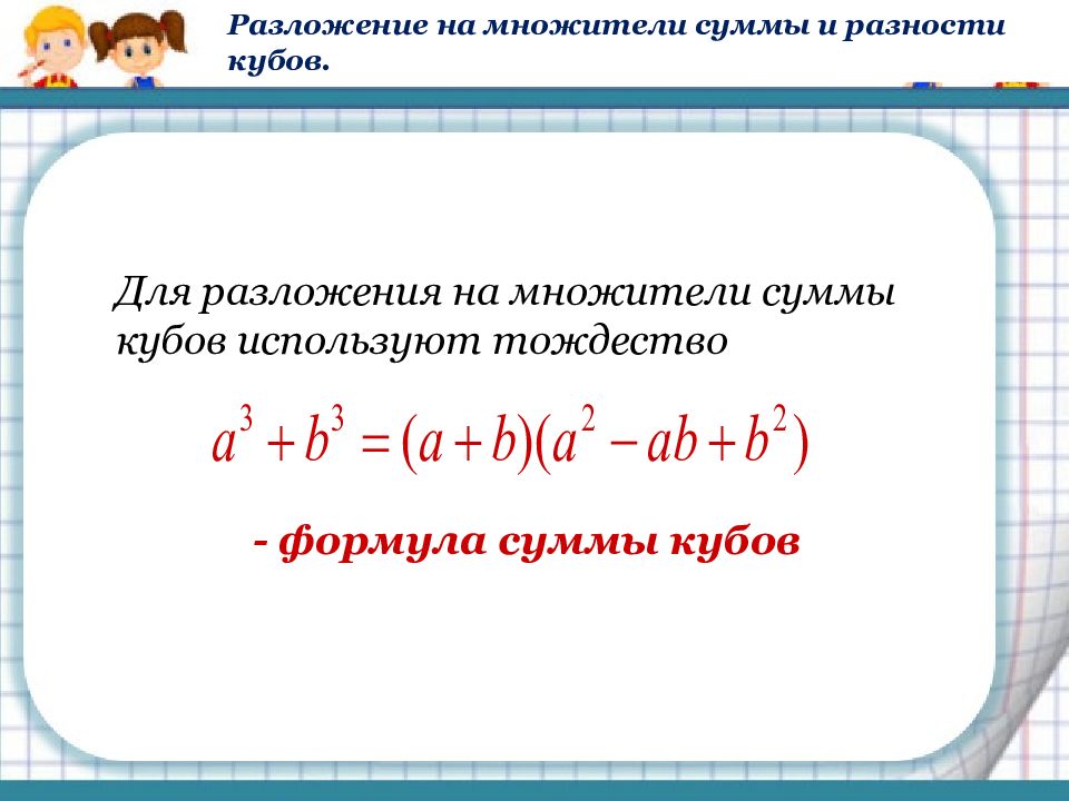 Разложение на множители суммы и разности кубов. Разложение на множители суммы и разности кубов. Для разложения на множители суммы кубов используют тождество - формула суммы кубов Разложение на множители суммы и разности кубов.
