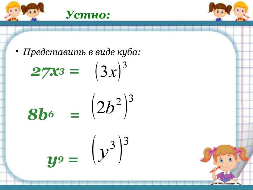 Разложите на множители: а ) 1 3 - ( 2x) 3 б ) m 3 -n 3 в ) x 3 +1 3 г ) 125 +c 3 д ) 8 +a 3 е ) x 3 - 64 ж ) 8 x 3 -1 з ) x 3 - 27y 3 Письменно :