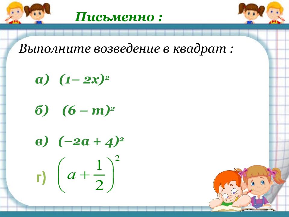 Письменно : Выполните возведение в квадрат : а ) ( 1 – 2x ) 2 б) ( 6 – m ) 2 в) (– 2 a + 4 ) 2 г )