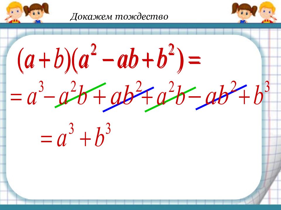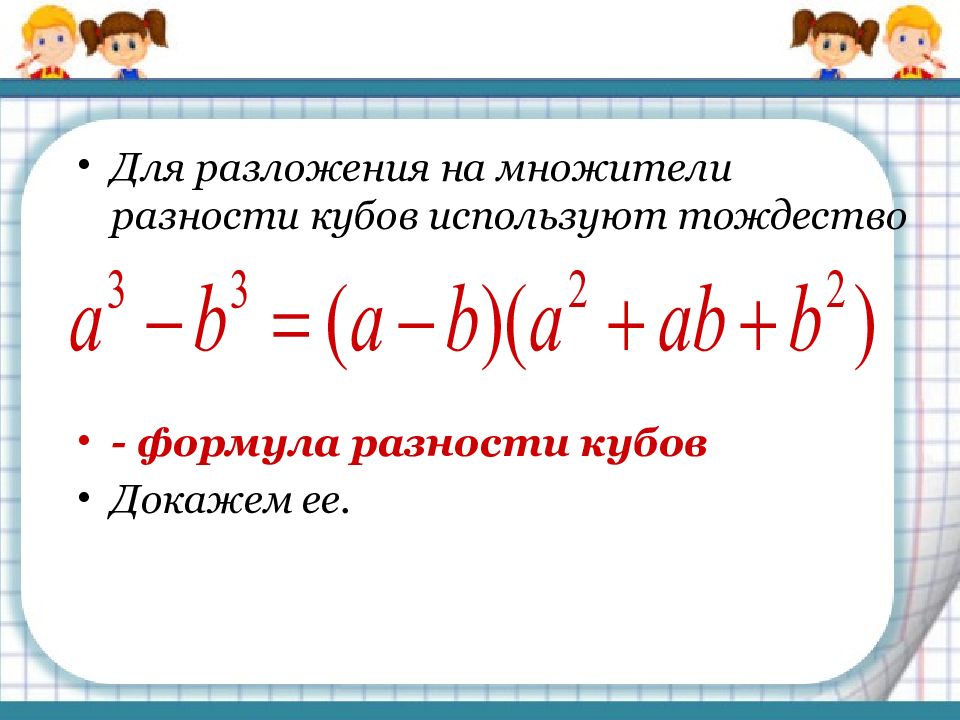 Для разложения на множители разности кубов используют тождество - формула разности кубов Докажем ее.