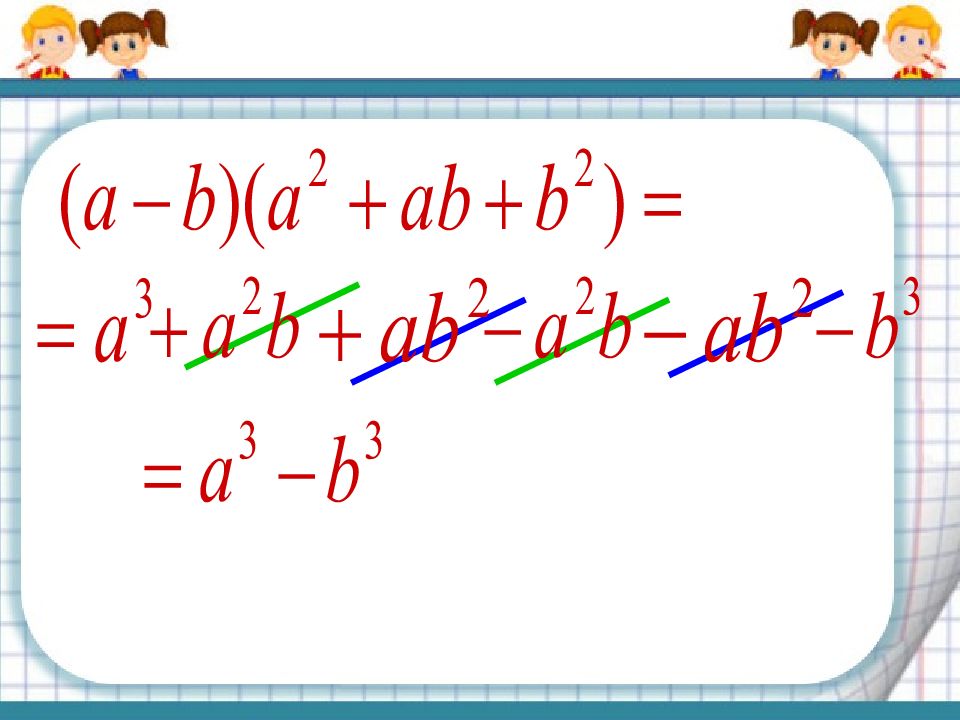 Разность кубов двух выражений равна произведению разности этих выражений на неполный квадрат суммы.