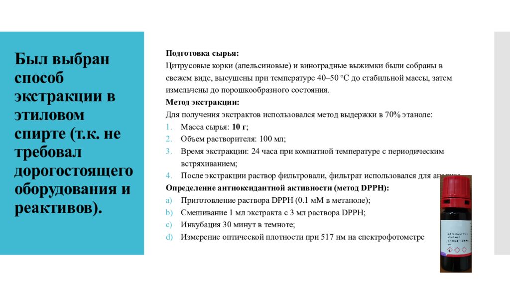 Подготовка сырья: Цитрусовые корки (апельсиновые) и виноградные выжимки были собраны в свежем виде, высушены при температуре 40–50 °C до стабильной массы, затем измельчены до порошкообразного состояния. Метод экстракции: Для получения экстрактов использовался метод выдержки в 70% этаноле: Масса сырья: 10 г ; Объем растворителя: 100 мл; Время экстракции: 24 часа при комнатной температуре с периодическим встряхиванием; После экстракции раствор фильтровали, фильтрат использовался для анализа. Определение антиоксидантной активности (метод DPPH): Приготовление раствора DPPH (0.1 мМ в метаноле); Смешивание 1 мл экстракта с 3 мл раствора DPPH; Инкубация 30 минут в темноте; Измерение оптической плотности при 517 нм на спектрофотометре