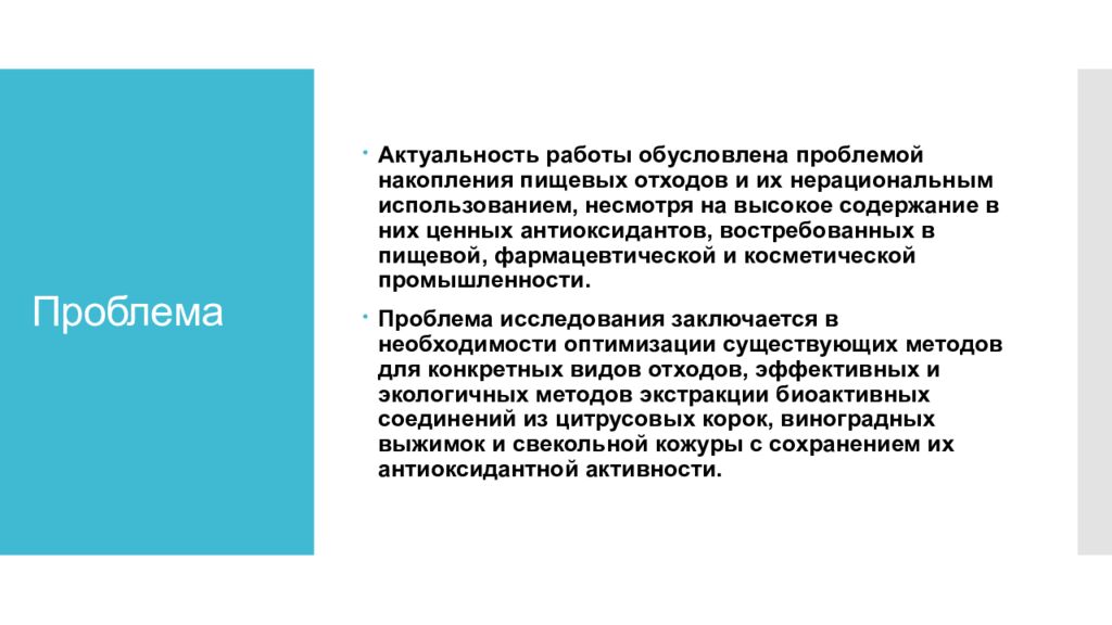 Актуальность работы обусловлена проблемой накопления пищевых отходов и их нерациональным использованием, несмотря на высокое содержание в них ценных антиоксидантов, востребованных в пищевой, фармацевтической и косметической промышленности. Проблема исследования заключается в необходимости оптимизации существующих методов для конкретных видов отходов, эффективных и экологичных методов экстракции биоактивных соединений из цитрусовых корок, виноградных выжимок и свекольной кожуры с сохранением их антиоксидантной активности.