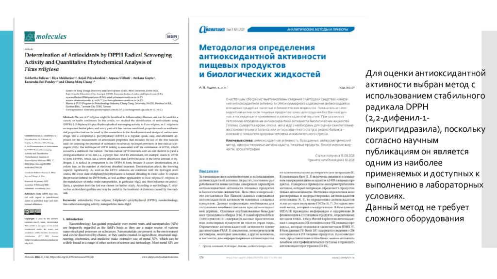 Для оценки антиоксидантной активности выбран метод с использованием стабильного радикала DPPH ( 2,2-дифенил-1-пикрилгидразила), поскольку согласно научным публикациям он является одним из наиболее применяемых и доступных к выполнению в лабораторных условиях. Данный метод не требует сложного оборудования