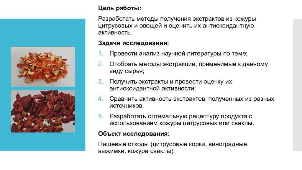 Цель работы: Разработать методы получения экстрактов из кожуры цитрусовых и овощей и оценить их антиоксидантную активность. Задачи исследования: Провести анализ научной литературы по теме; Отобрать методы экстракции, применимые к данному виду сырья; Получить экстракты и провести оценку их антиоксидантной активности; Сравнить активность экстрактов, полученных из разных источников. Разработать оптимальную рецептуру продукта с использованием кожуры цитрусовых или свеклы. Объект исследования: Пищевые отходы (цитрусовые корки, виноградные выжимки, кожура свеклы).