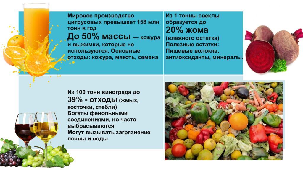 Мировое производство цитрусовых превышает 158 млн тонн в год До 50% массы — кожура и выжимки, которые не используются. Основные отходы: кожура, мякоть, семена Из 1 тонны свеклы образуется до 20% жома (влажного остатка) Полезные остатки: Пищевые волокна, антиоксиданты, минералы. Из 100 тонн винограда до 39% - отходы (жмых, косточки, стебли) Богаты фенольными соединениями, но часто выбрасываются Могут вызывать загрязнение почвы и воды