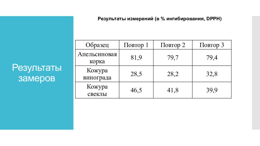 Образец Повтор 1 Повтор 2 Повтор 3 Апельсиновая корка 81,9 79,7 79,4 Кожура винограда 28,5 28,2 32,8 Кожура свеклы 46,5 41,8 39,9 Результаты измерений (в % ингибирования, DPPH)