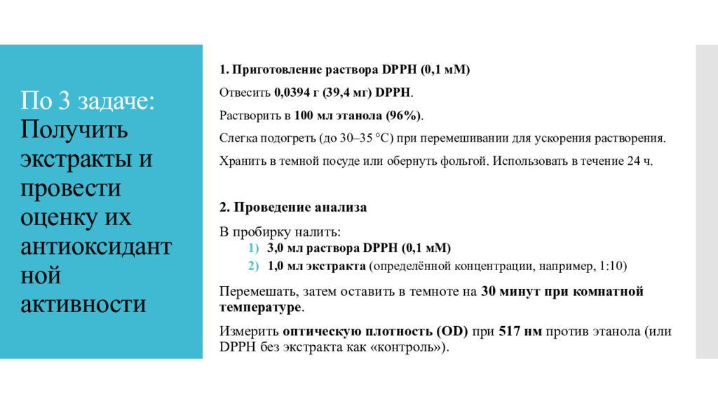 1. Приготовление раствора DPPH (0,1 мМ ) Отвесить 0,0394 г (39,4 мг) DPPH. Растворить в 100 мл этанола (96%). Слегка подогреть (до 30–35 °C) при перемешивании для ускорения растворения. Хранить в темной посуде или обернуть фольгой. Использовать в течение 24 ч. 2. Проведение анализа В пробирку налить: 3,0 мл раствора DPPH (0,1 мМ ) 1,0 мл экстракта (определённой концентрации, например, 1:10) Перемешать, затем оставить в темноте на 30 минут при комнатной температуре. Измерить оптическую плотность (OD) при 517 нм против этанола (или DPPH без экстракта как «контроль»).