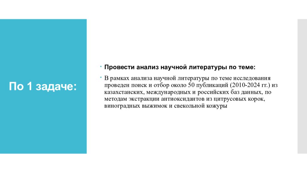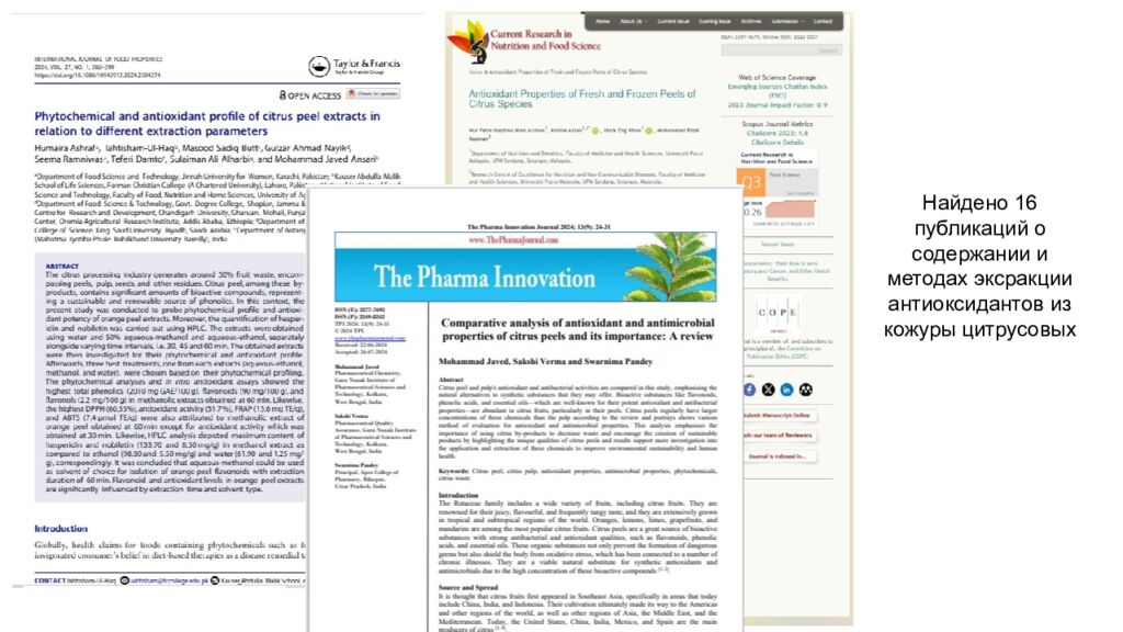 Провести анализ научной литературы по теме: В рамках анализа научной литературы по теме исследования проведен поиск и отбор около 50 публикаций ( 2010-2024 гг.) из казахстанских, международных и российских баз данных, по методам экстракции антиоксидантов из цитрусовых корок, виноградных выжимок и свекольной кожуры