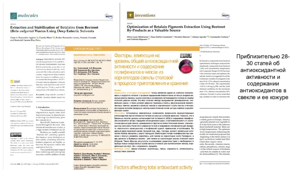 Приблизительно 28-30 статей об антиоксидантной активности и содержании антиоксидантов в свекле и ее кожуре