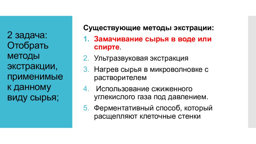 Слайд 9: 2 задача: Отобрать методы экстракции, применимые к данному виду сырья;