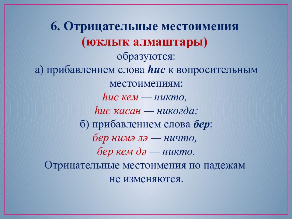 6. Отрицательные местоимения ( юҡлыҡ алмаштары ) образуются : а) прибавлением слова һис к вопросительным местоимениям: һис кем — никто, һис ҡасан — никогда; б) прибавлением слова бер : бер нимә лә — ничто, бер кем дә — никто. Отрицательные местоимения по падежам не изменяются.