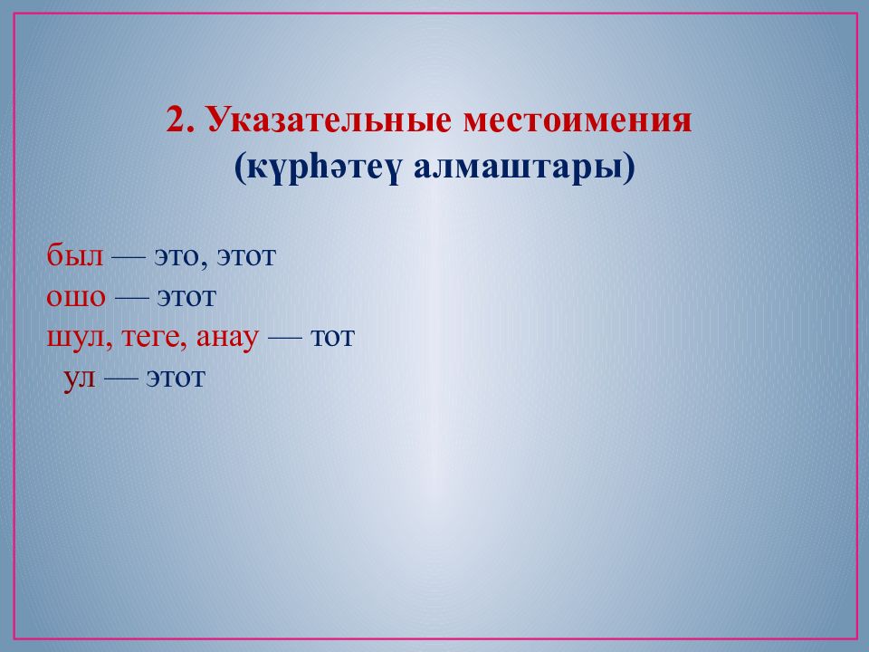 2. Указательные местоимения ( күрһәтеү алмаштары ) был — это, этот ошо — этот шул, теге, анау — тот ул — этот