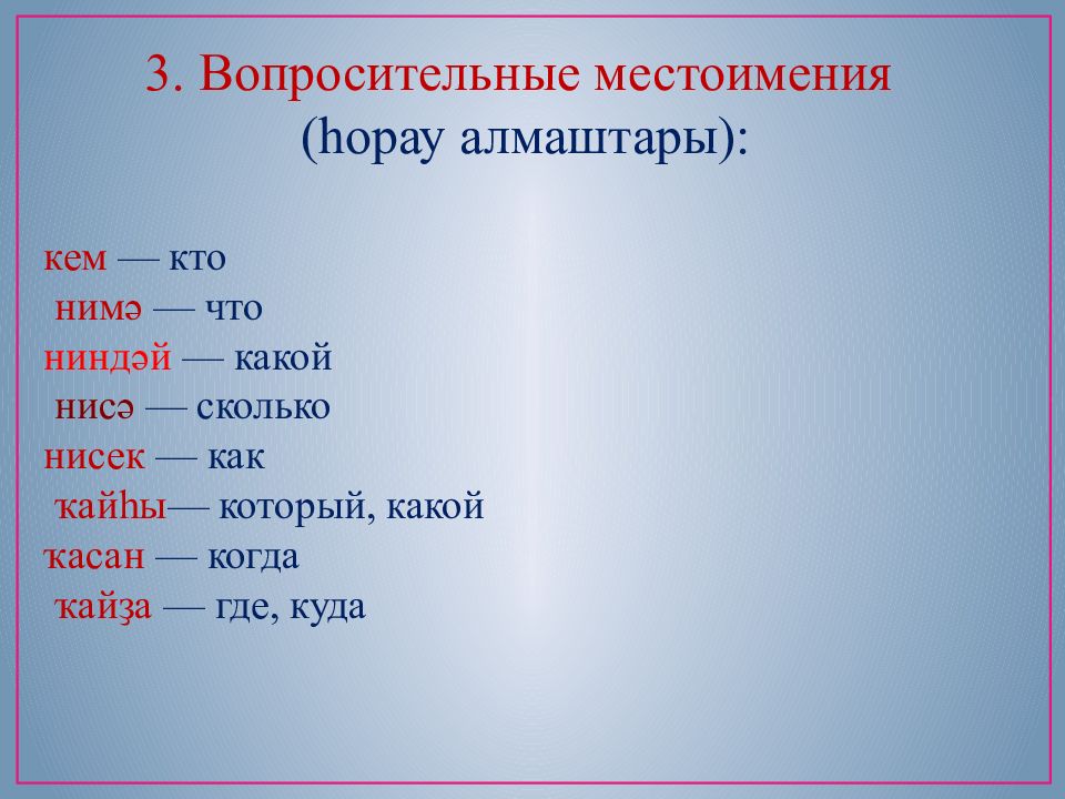 3. Вопросительные местоимения ( һорау алмаштары ): кем — кто нимә — что ниндәй — какой нисә — сколько нисек — как ҡайһы — который, какой ҡасан — когда ҡайҙа — где, куда
