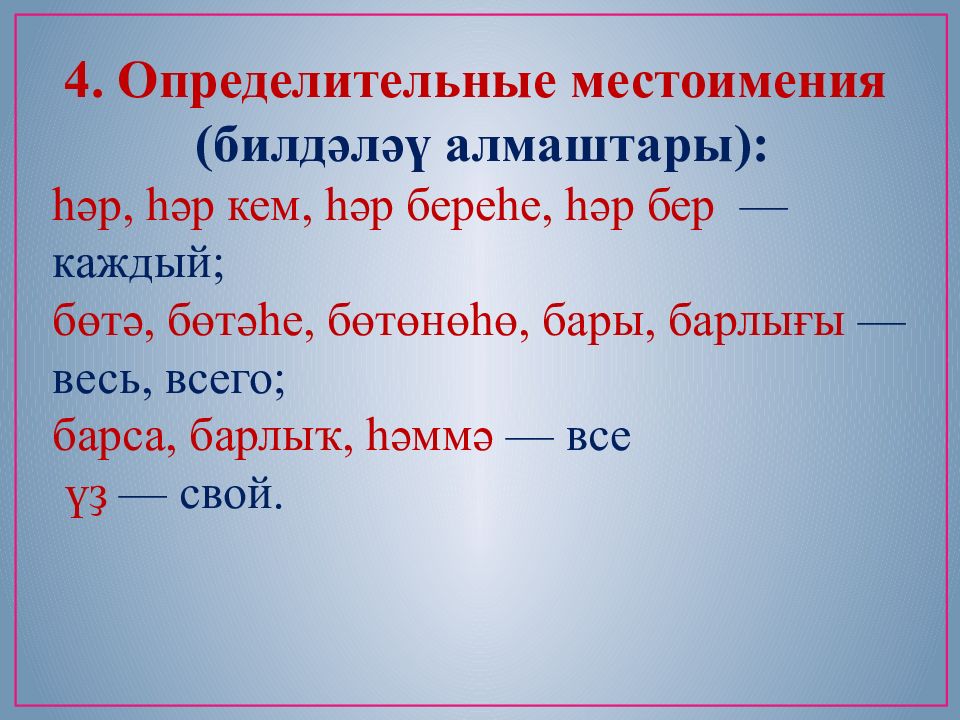 4. Определительные местоимения ( билдәләү алмаштары ): һәр, һәр кем, һәр береһе, һәр бер — каждый; бөтә, бөтәһе, бөтөнөһө, бары, барлығы — весь, всего; барса, барлыҡ, һәммә — все үҙ — свой.