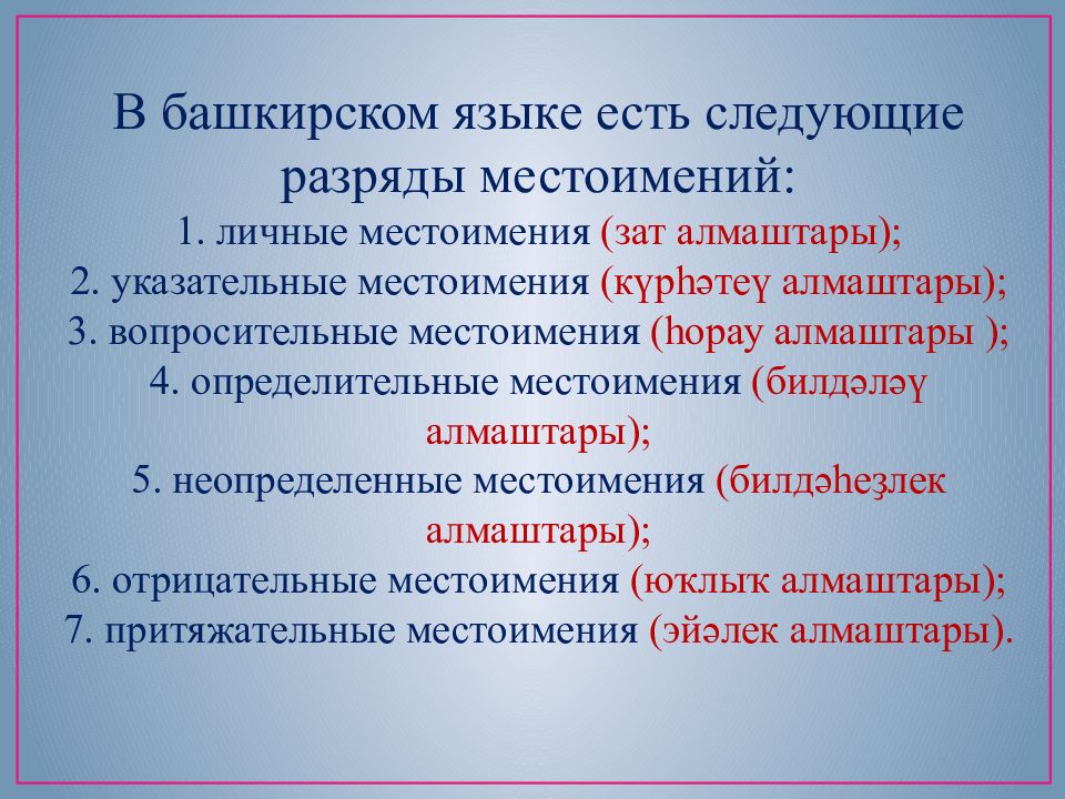 В башкирском языке есть следующие разряды местоимений: 1. личные местоимения ( зат алмаштары ); 2. указательные местоимения ( күрһәтеү алмаштары ); 3. вопросительные местоимения ( һорау алмаштары ); 4. определительные местоимения ( билдәләү алмаштары ); 5. неопределенные местоимения ( билдәһеҙлек алмаштары ); 6. отрицательные местоимения ( юҡлыҡ алмаштары ); 7. притяжательные местоимения ( эйәлек алмаштары ).