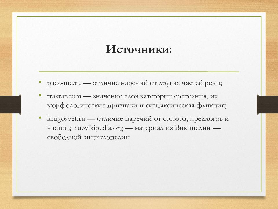 pack-me.ru — отличие наречий от других частей речи; traktat.com — значение слов категории состояния, их морфологические признаки и синтаксическая функция; krugosvet.ru — отличие наречий от союзов, предлогов и частиц; ru.wikipedia.org — материал из Википедии — свободной энциклопедии