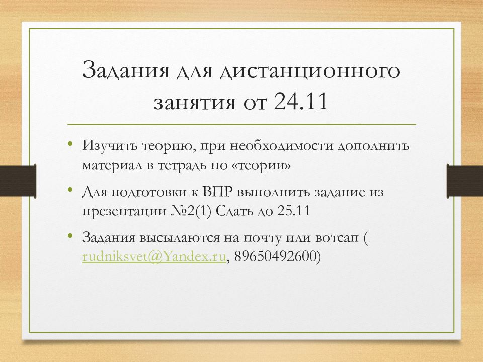 Изучить теорию, при необходимости дополнить материал в тетрадь по «теории» Для подготовки к ВПР выполнить задание из презентации №2(1) Сдать до 25.11 Задания высылаются на почту или вотсап ( rudniksvet@Yandex.ru, 89650492600)