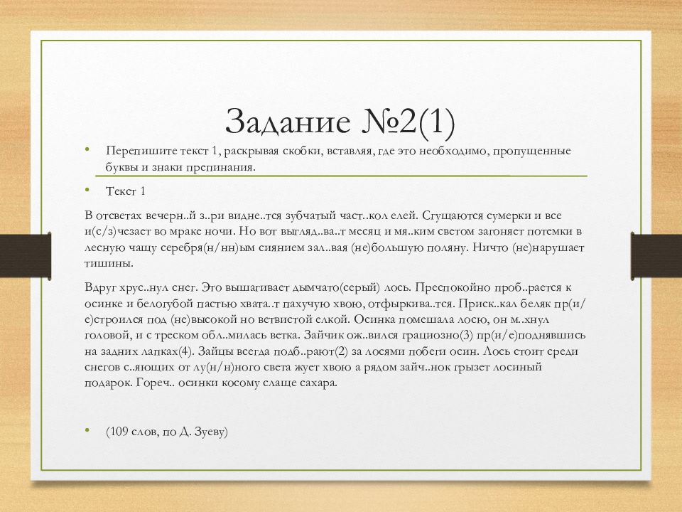 Перепишите текст 1, раскрывая скобки, вставляя, где это необходимо, пропущенные буквы и знаки препинания. Текст 1 В отсветах вечерн..й з.. ри видне.. тся зубчатый част..кол елей. Сгущаются сумерки и все и(с/з) чезает во мраке ночи. Но вот выгляд.. ва..т месяц и мя..ким светом загоняет потемки в лесную чащу серебря(н/ нн ) ым сиянием зал.. вая (не)большую поляну. Ничто (не)нарушает тишины. Вдруг хрус.. нул снег. Это вышагивает дымчато (серый) лось. Преспокойно проб.. рается к осинке и белогубой пастью хвата..т пахучую хвою, отфыркива.. тся. Приск..кал беляк пр (и/е)строился под (не)высокой но ветвистой елкой. Осинка помешала лосю, он м.. хнул головой, и с треском обл.. милась ветка. Зайчик ож..вился грациозно(3) пр (и/е)поднявшись на задних лапках(4). Зайцы всегда подб.. рают (2) за лосями побеги осин. Лось стоит среди снегов с.. яющих от лу (н/н) ного света жует хвою а рядом зайч..нок грызет лосиный подарок. Гореч.. осинки косому слаще сахара. (109 слов, по Д. Зуеву)