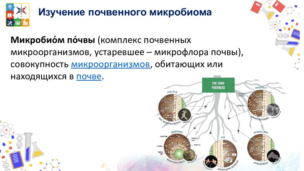Изучение почвенного микробиома Микробио́м по́чвы (комплекс почвенных микроорганизмов, устаревшее – микрофлора почвы), совокупность микроорганизмов, обитающих или находящихся в почве.