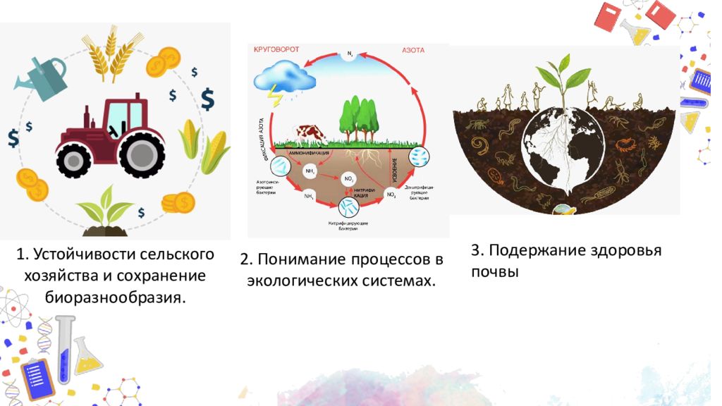 1. Устойчивости сельского хозяйства и сохранение биоразнообразия. 2. Понимание процессов в экологических системах. 3. Подержание здоровья почвы