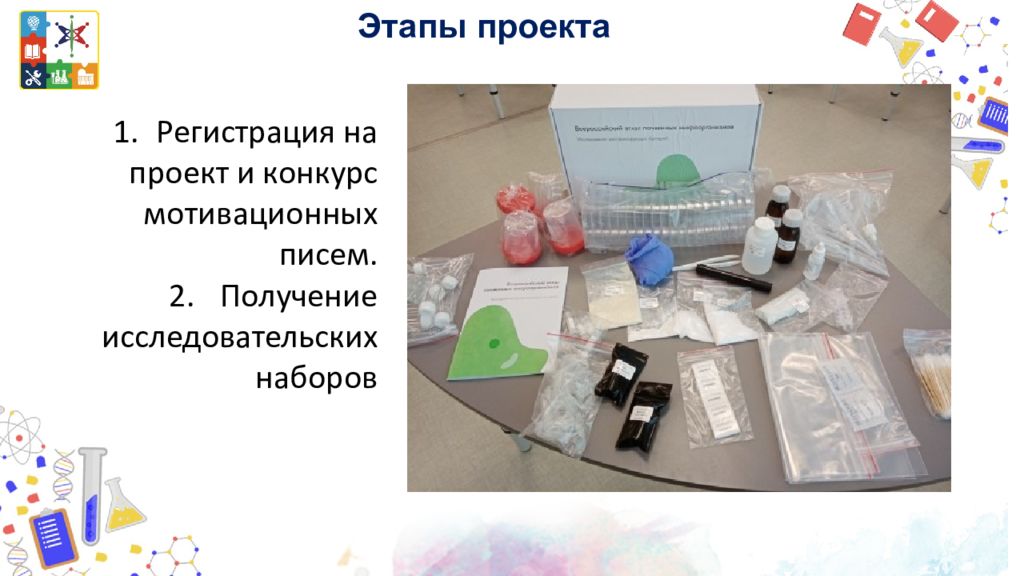 Регистрация на проект и конкурс мотивационных писем. Получение исследовательских наборов Этапы проекта