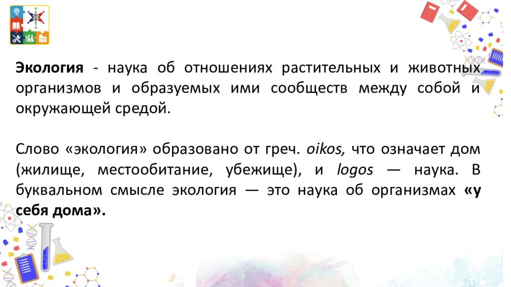 Экология - наука об отношениях растительных и животных организмов и образуемых ими сообществ между собой и окружающей средой. Слово «экология» образовано от греч. oikos, что означает дом (жилище, местообитание, убежище), и logos — наука. В буквальном смысле экология — это наука об организмах «у себя дома».