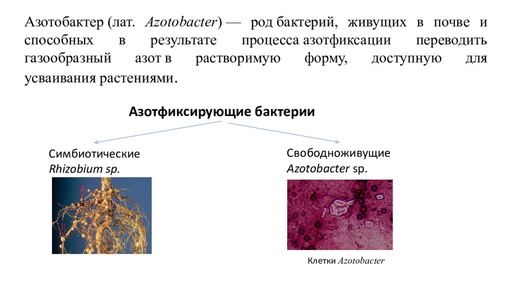 Азотобактер (лат. Azotobacter ) — род бактерий, живущих в почве и способных в результате процесса азотфиксации переводить газообразный азот в растворимую форму, доступную для усваивания растениями. Клетки Azotobacter Азотфиксирующие бактерии Симбиотические Rhizobium sp. Свободноживущие Azotobacter sp.