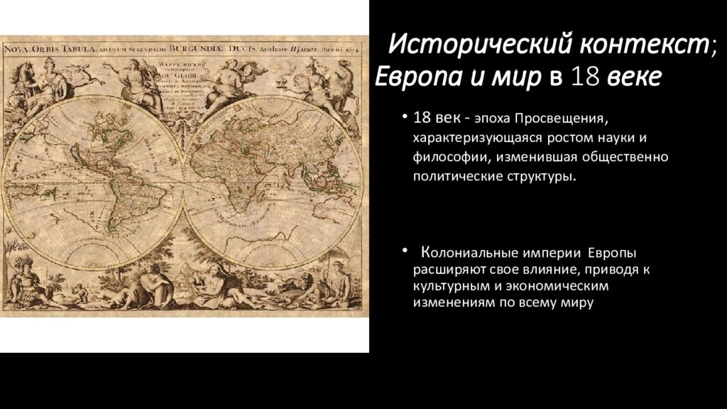 18 век - эпоха Просвещения, характеризующаяся ростом науки и философии, изменившая общественно политические структуры. К олониальные империи Европы расширяют свое влияние, приводя к культурным и экономическим изменениям по всему миру